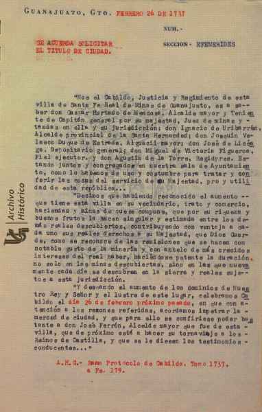 Debido a las repetidas inundaciones que devastaron a la ciudad, así como a los dramáticos eventos de la lucha por la Independencia, la documentación no se encuentra completa, ya que -por citar un ejemplo- durante la toma de la Alhóndiga de Granaditas por el ejército insurgente en septiembre de 1810, se perdió una parte del archivo de la ciudad que ahí se resguardaba.