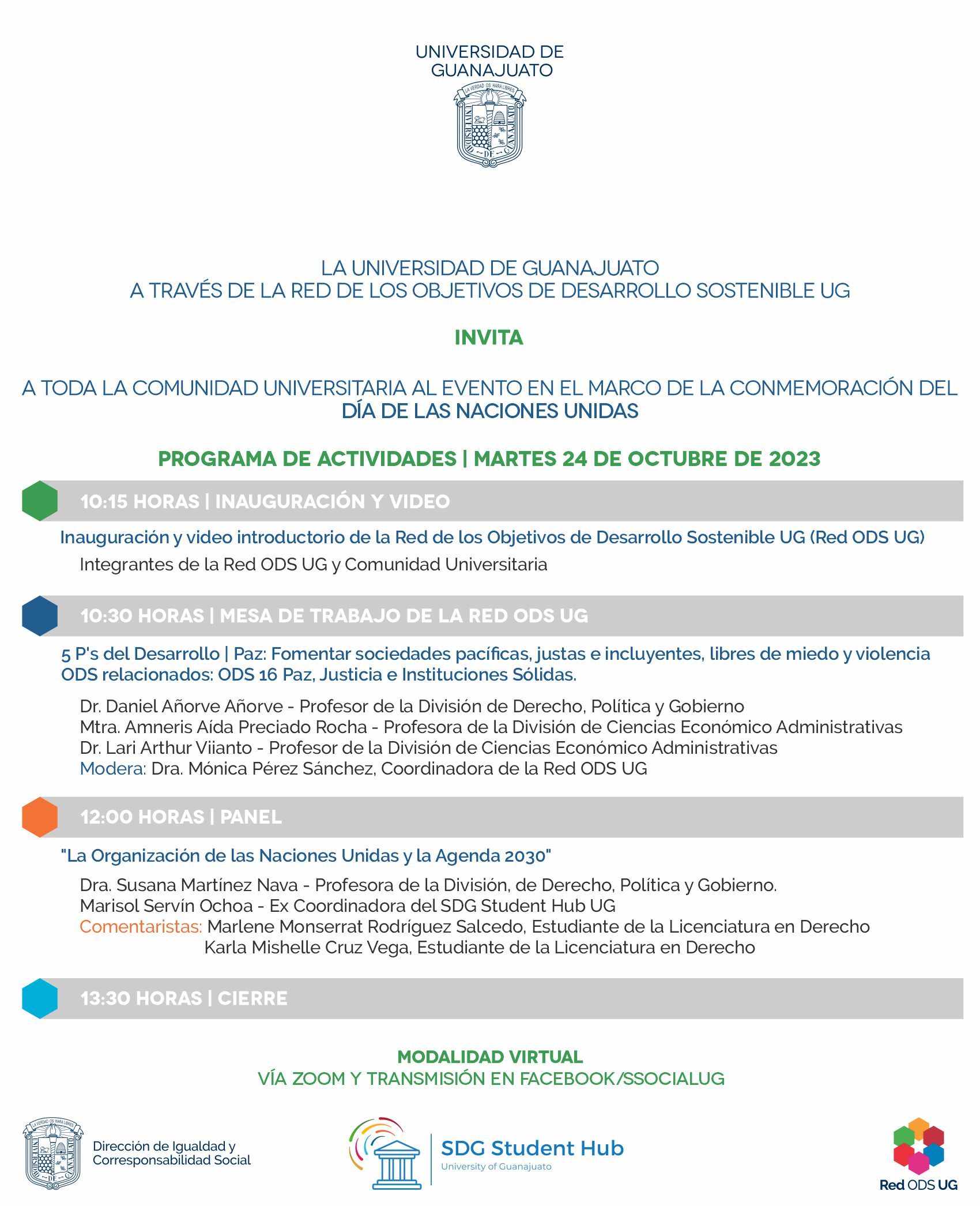 ¡Abeja UG! No te pierdas el programa en conmemoración del Día de las Naciones Unidas que la Red de los Objetivos de Desarrollo Sostenible de la Universidad de Guanajuato (Red ODS UG) y el SDG Student Hub UG tienen para ti.