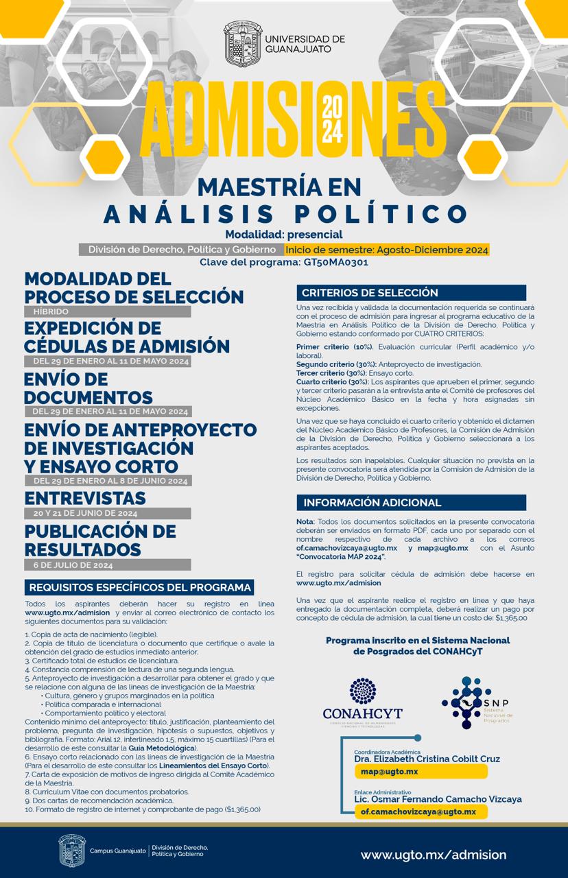 La Maestría en Análisis Político de la Universidad de Guanajuato forma parte del Sistema Nacional de Posgrados (SNP) del Consejo Nacional de Humanidades, Ciencias y Tecnologías (Conahcyt), por lo cual sus estudiantes pueden postular a una beca a lo largo de sus estudios. Se cuenta con un sistema escolarizado de cuatro semestres, durante los cuales existe el acompañamiento de un Comité Tutorial con la intención de fortalecer la formación de profesionales que aporten conocimientos originales al corpus teórico-metodológico de la ciencia política a través de la redacción de un producto de investigación que muestre un sólido dominio conceptual, operativo y actualizado del área de investigación que esté desarrollando el alumno.