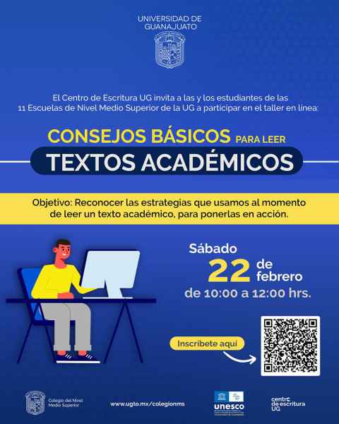 - Lectura: estrategias de lectura de textos académicos, tipos y funciones de la lectura, organizadores gráficos, mapas, resúmenes, cuadros sinópticos, instrumentos metacognitivos, etc.