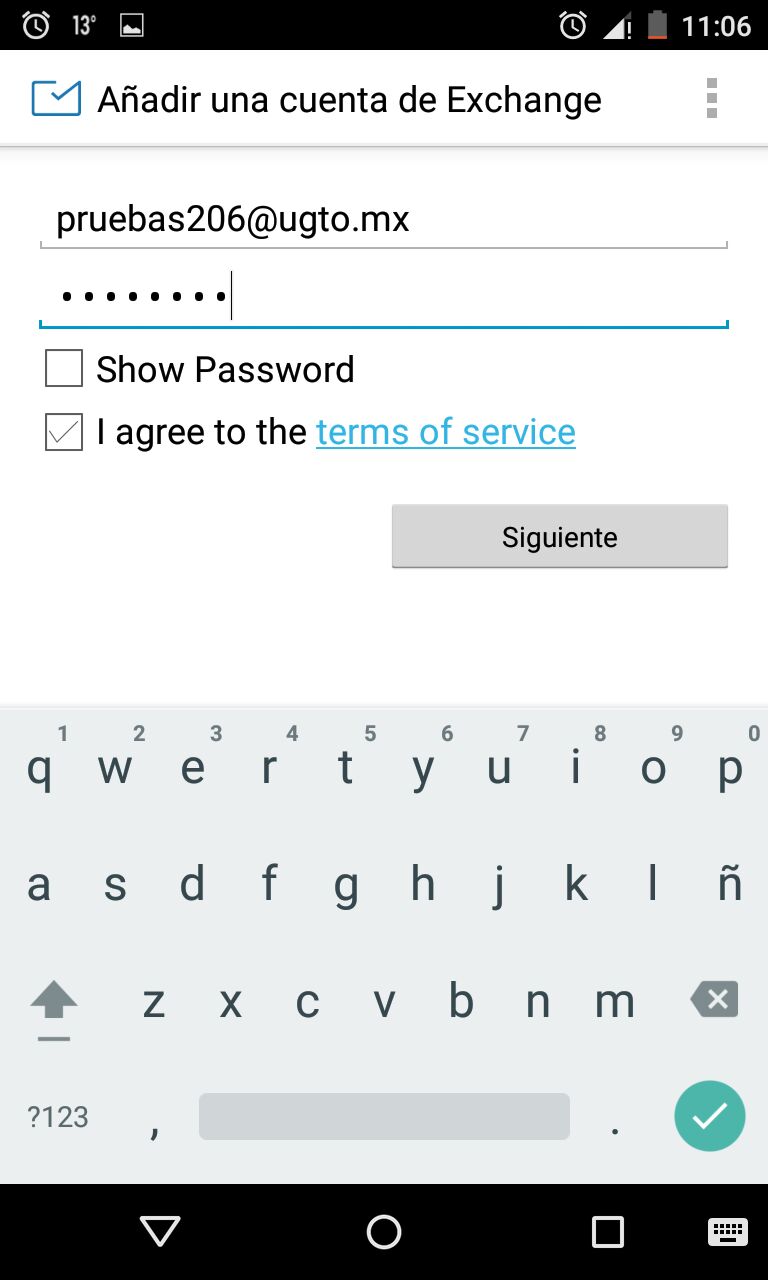 Ingrese los datos de su cuenta de Correo Institucional y seleccione "I agree to the terms of service" y de clic en "Siguiente":