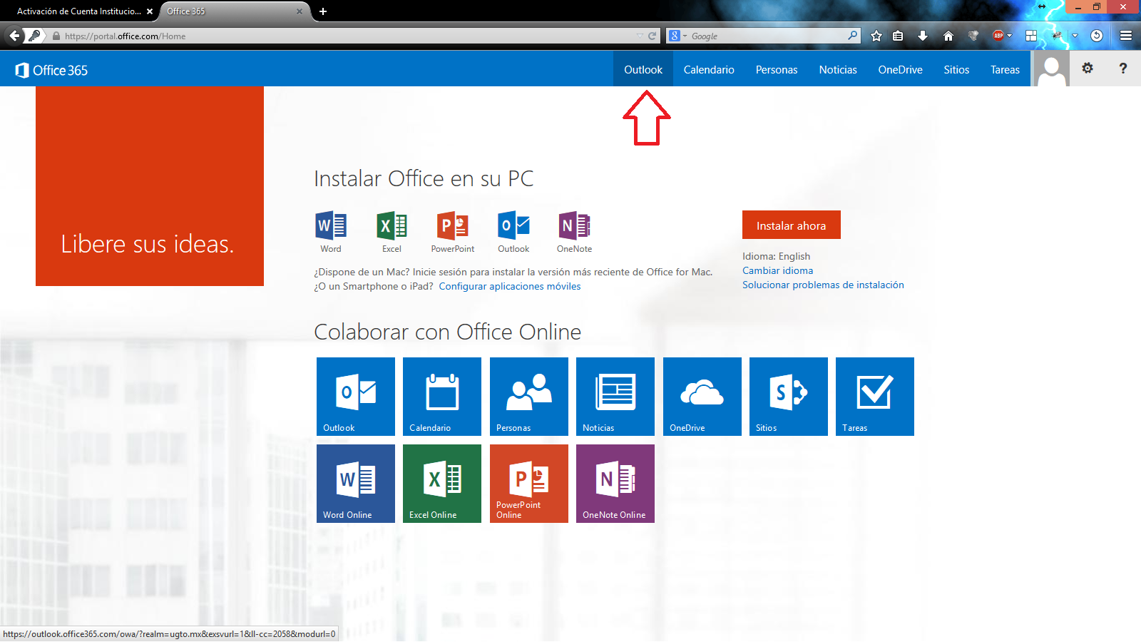 6.- Mostrara la siguiente pantalla de bienvenida, dar clic en el apartado Outlook:
