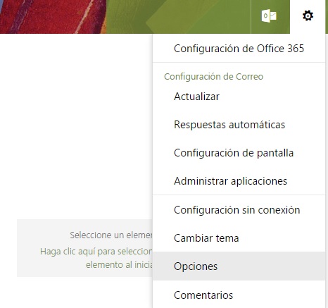 Ingresamos a nuestra de correo institucional desde la web. Una vez dentro hacemos clic sobre el engrane que se encuentra en la parte superior derecha de nuestro buzón y hacemos clic en Opciones tal como se muestra en la imagen: