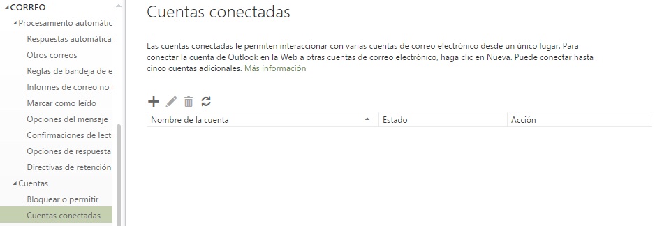 Una vez dentro, ingresamos a CORREO > Cuentas conectadas y hacemos clic sobre el símbolo + como se muestra en la imagen.