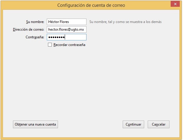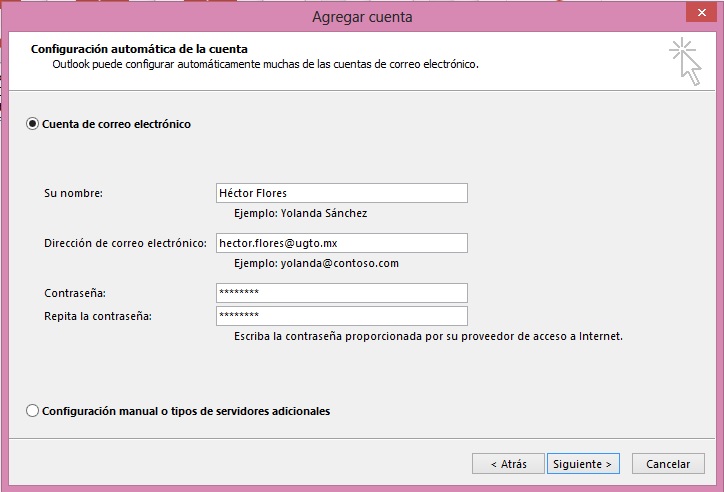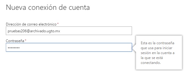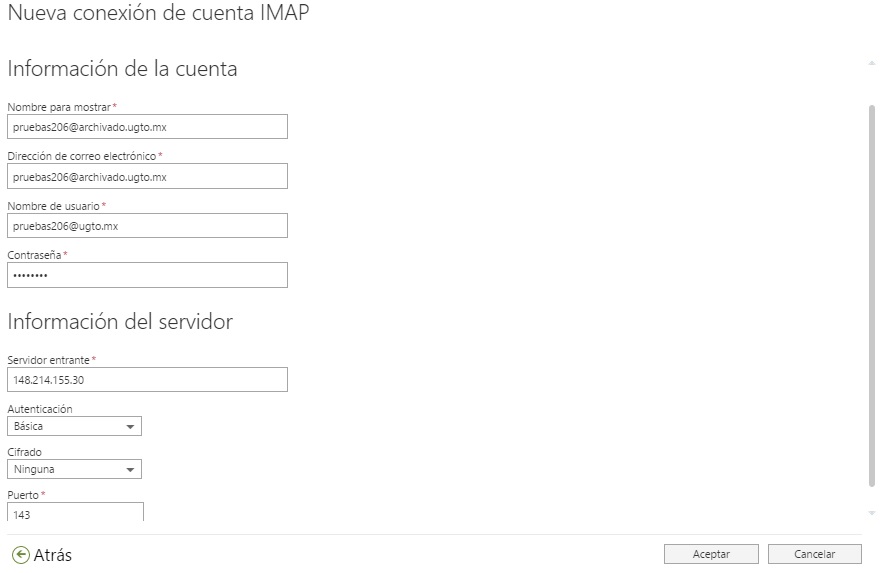 Posteriormente capturaremos nuevamente nuestra cuenta de correo institucional con dominio @archivado.ugto.mx y la siguiente información del servidor: