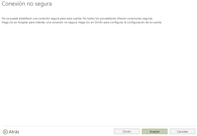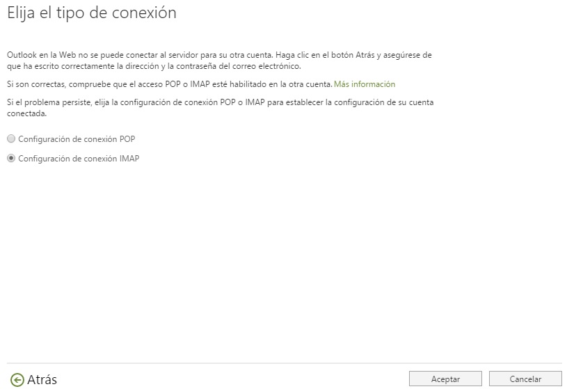 Elegiremos el tipo de Configuración de conexión IMAP y hacemos clic en Aceptar