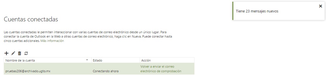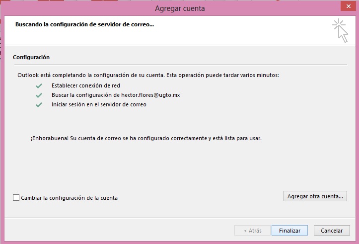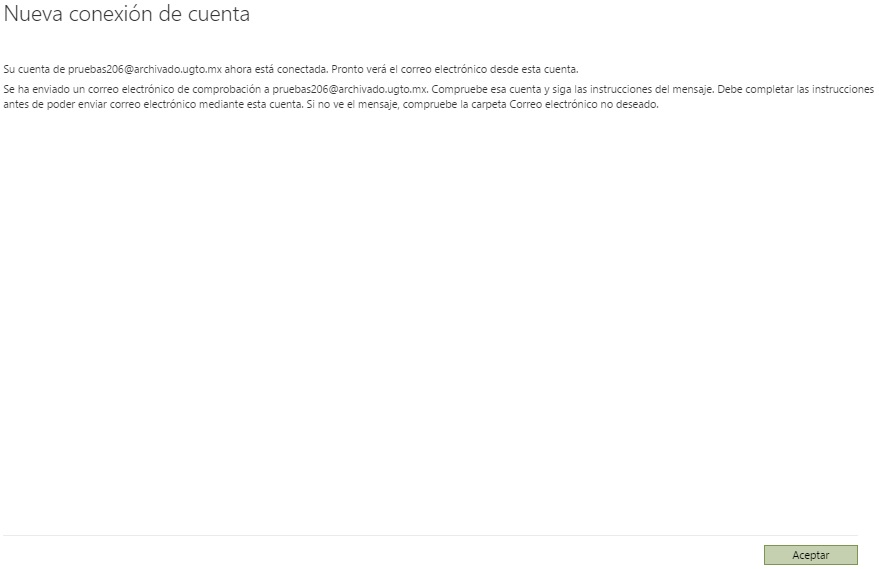 Al terminar la configuración se mostrará un mensaje en el cual nos indica que la cuenta está conectada. Hacemos clic en Aceptar