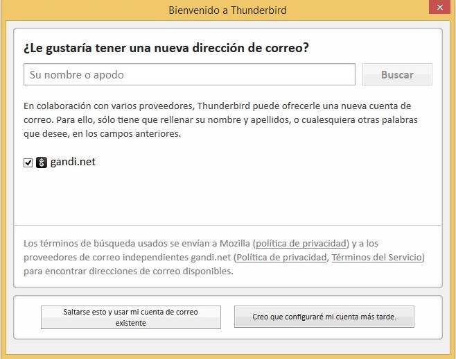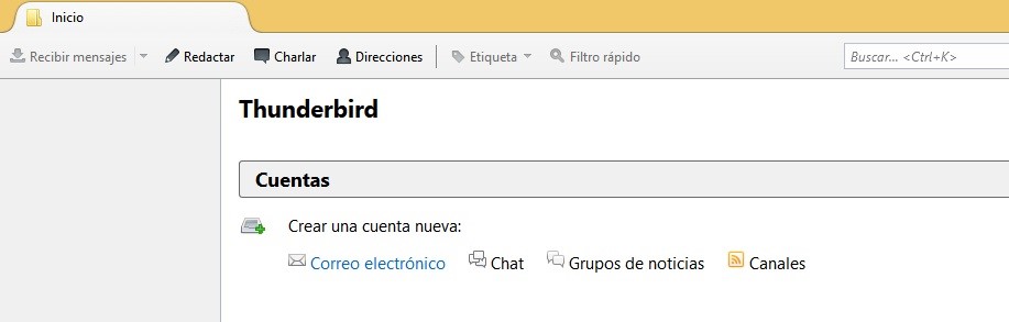 Empezamos abriendo Thunderbird, una vez cargado el programa seleccionamos Crear una cuenta nueva: Correo electrónico tal como se muestra en la imagen. Para algunas versiones de Thunderbird es necesario ingresar a Archivo > Nuevo > Cuenta de Correo
