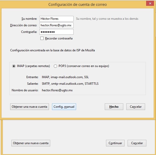 Nos aparecerá la siguiente pantalla la cual nos reconocerá por default los servidores de Microsoft, elegimos la opción IMAP o POP según lo requiera y hacemos clic en "Config. manual".
