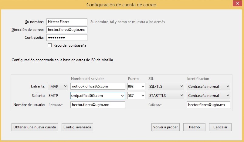 Una vez capturada la información hacemos clic en "Hecho". Ahora tendremos nuestra cuenta de correo institucional conectada al cliente Thunderbird.