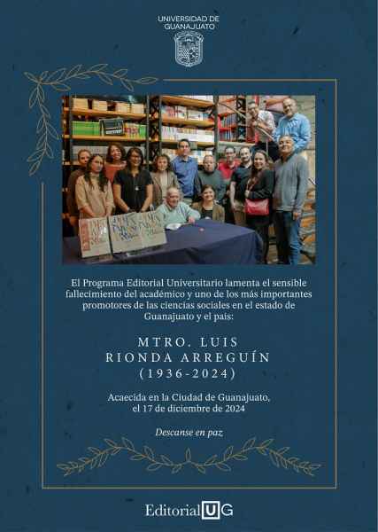 El Programa Editorial Universitario de la Universidad de Guanajuato lamenta el sensible fallecimiento de quien fuera autor de esta Institución, académico y uno de los más importantes promotores de las ciencias sociales y, particularmente, de la Filosofía, en el estado de Guanajuato y el país, Mtro. Luis Rionda Arreguín (1936-2024), acaecida el pasado 17 de diciembre de 2024.