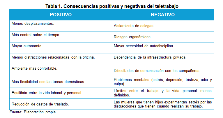 Finalmente, es pertinente mencionar que, a pesar de que los principales resultados de las investigaciones en el tema del teletrabajo corroboran el efecto de una experiencia positiva, sobre todo porque se pueden generar las condiciones ideales para tener un equilibrio entre la vida personal y laboral (Erro-Garcés et al., 2022); en contraste, hallazgos de otras investigaciones han reportado que las personas que trabajan desde casa han sido diagnosticados con problemas mentales, tales como, la depresión, la tristeza, el estrés, el odio y la culpa (Radulovic, Djukanovic and Vukcevic, 2022). A continuación, la Tabla 1, resume las principales ventajas y desventajas del teletrabajo.
