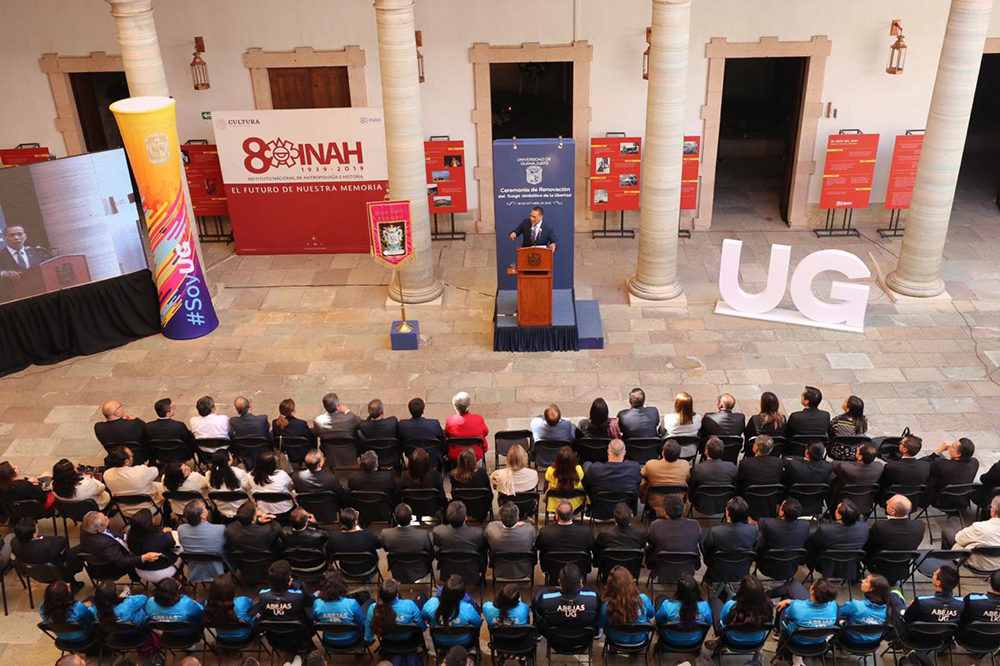 Guanajuato, Gto., a 28 de octubre de 2019.- Integrantes de la comunidad universitaria participaron en la renovación del fuego simbólico de la libertad en la Alhóndiga, una ceremonia que honra la memoria de quienes participaron en la batalla del 28 de septiembre de 1810 y simboliza la vigencia de los ideales por los que lucharon durante el proceso de Independencia.