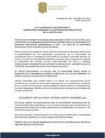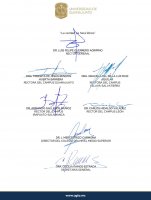 El comunicado está firmado por el Rector General de la UG, Dr. Luis Felipe Guerrero Agripino; las y los Rectores de los campus Guanajuato, Celaya-Salvatierra, León, e Irapuato-Salamanca, Dra. Teresita de Jesús Rendón Huerta Barrera, Dra. Graciela Ma. de la Luz Ruiz Aguilar; Dr. Carlos Hidalgo Valadez y el Dr. Armando Gallegos Muñoz -respectivamente-, así como por el Director del Colegio del Nivel Medio Superior, Dr. J. Merced Rizo Carmona, y la Secretaria General, Dra. Cecilia Ramos Estrada.