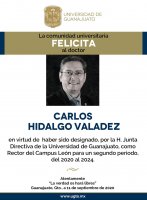 Guanajuato, Gto., a 11 de septiembre de 2020.- Con apego a la normatividad universitaria, la Junta Directiva de la Máxima Casa de Estudios del estado designó Rector del Campus León al Dr. Carlos Hidalgo Valadez, quien estará así un segundo periodo en dicho cargo, del 2020-2024.