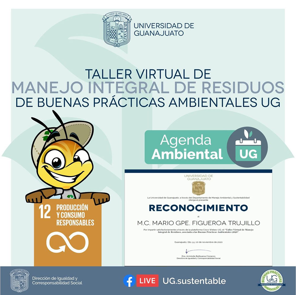 Estas acciones universitarias, como parte del fortalecimiento y seguimiento a la red de enlaces para la gestión de la sustentabilidad de la UG, se encuentran alineadas al Programa de Educación para la Sustentabilidad en temas de divulgación del Departamento de Manejo Ambiental y Sustentabilidad de la Dirección de Igualdad y Corresponsabilidad Social, el cual fortalece a la Agenda Ambiental UG 2019-2023.