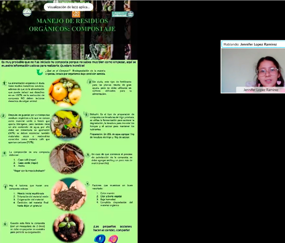 Las y los estudiantes participantes presentaron materiales virtuales de aprendizaje consistentes en infografías, carteles y videos, con contenidos que impulsan la cultura de respeto al medio ambiente fortaleciendo además la responsabilidad social universitaria, al dar soluciones a problemáticas ambientales que afectan sus entornos, enfocados en: El cuidado y uso adecuado del agua y la energía; el consumo responsable relacionado con el adecuado manejo de residuos, y el manejo de áreas verdes.