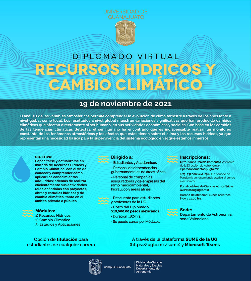 Guanajuato, Gto., a 10 de septiembre de 2021.- El recurso hídrico ha sido afectado por la falta de lluvias y disminución en las precipitaciones en todo el país, entre otros factores ambientales. Debido a esto, la Universidad de Guanajuato (UG) invita a su comunidad y personas interesadas en el tema, a cursar el Diplomado en Cambio Climático y Recursos Hídricos.