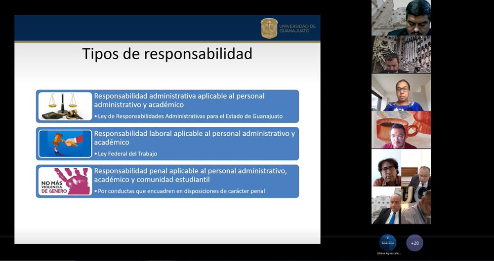 Durante estas sesiones se ha dado a conocer la correcta activación del nuevo Reglamento de Responsabilidades y Sanciones en Materia de Violencia de Género; las reformas al Protocolo de Atención a Casos de Violencia de Género de la UG; sobre el Código de Ética y la emisión de un nuevo Código de Ética de las Personas Servidoras Públicas; así como la incorporación del lenguaje inclusivo y no sexista al Estatuto Orgánico.