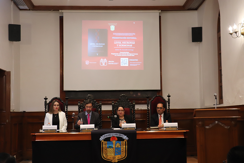 Sobre "Leyes, neuronas y hormonas", la Dra. Rendón Huerta Barrera, expuso que en sus páginas se encuentra una temática tan vigente como es el futuro del Derecho, ahora que las ciencias nos confirman que somos máquinas biológicas y que nuestra conducta personal no obedece tanto a las leyes sino a las neuronas y hormonas, como lo afirma el autor.