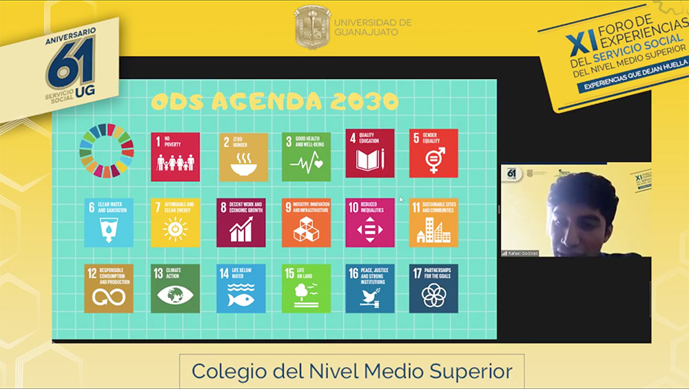 Además presentaron tres de los proyectos de alto impacto social que maneja el CNMS; se mostraron dos proyectos exitosos de autoría de estudiantes de la ENMS Celaya (recién egresadas), también se tuvo la participación de uno de los grupos organizados de la UG que difunden los Objetivos de Desarrollo Sustentable de la ONU con su ponencia: Abejas por la Agenda 2030. Se finalizó con un video Integrador de los proyectos de servicio social de las ENMS.