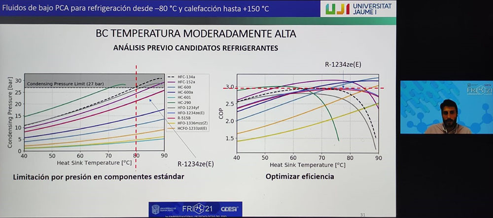 El evento académico comenzó con la participación del Dr. Adrián Mota Babiloni, de la Universitat Jaume I en Castellón de la Plana (España), con la conferencia magistral "Fluidos de bajo potencial de calentamiento atmosférico para refrigeración desde -80°C y calefacción hasta +150°C", quien mostró comparativos respecto al creciente precio del gas y la electricidad en Europa, así como estudios teóricos, ensayos y resultados experimentales de propiedades de fluidos, candidatos refrigerantes y sus ciclos.