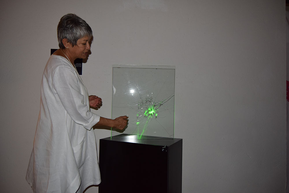 Durante su presentación titulada "De la cotidianidad de la naturaleza al arte, a través de la ciencia", dentro del eje temático Ciencia, Tecnología y Arte, la investigadora mostró algunas de las obras e instalaciones que ha presentado en México, España y Colombia, en un campo que denominó Nuevo Arte Óptico.