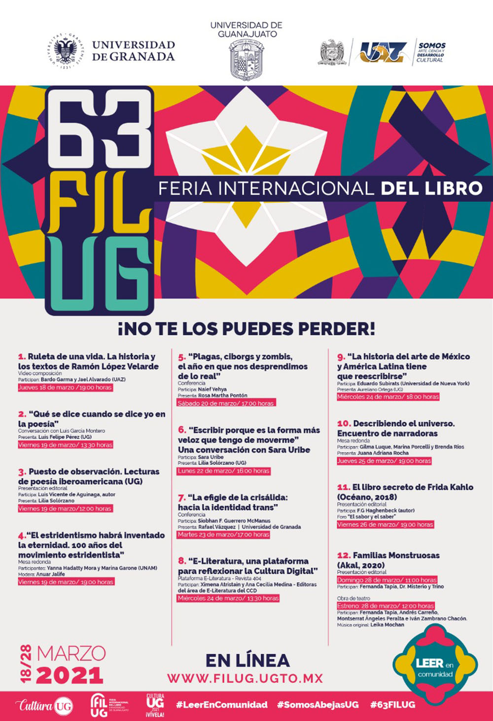 Guanajuato, Gto., a 18 de marzo de 2021.- Se inauguraron las actividades culturales de la 63 edición de la Feria del Libro de la Universidad de Guanajuato (FILUG), que en su segunda edición virtual se desarrollará del 18 al 28 de marzo, con más de 140 actividades que incluyen presentaciones editoriales, charlas, mesas de reflexión, homenajes, aniversarios, conferencias, ciclos, salas de cine, eventos artísticos, y exposiciones.