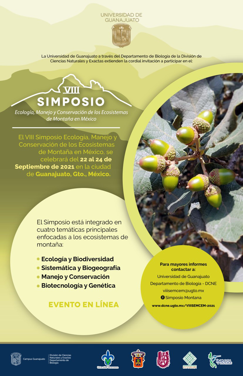 Del 22 al 24 de septiembre se realizará el -VIII Simposio Ecología, Manejo y Conservación de los Ecosistemas de Montaña en México - en modalidad virtual, espacio en que se reunirán especialistas en el área de los Ecosistemas de Montaña para promover su estudio, manejo y conservación. Con cuota de recuperación, estudiantes en general y UG $500 pesos; académicos y público en general $1,200 pesos. Para más informes: Esta dirección de correo electrónico está protegida contra spambots. Usted necesita tener Javascript activado para poder verla., o en el FB Simposio Montana.