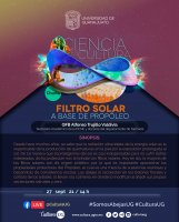 Por otra parte, a través del programa Ciencia es Cultura, el QFB Alfonso Trujillo Valdivia, Secretario Académico de la División de Ciencias Naturales y Exactas (DCNE) y docente del Departamento de Farmacia de la UG, expondrá "Filtro solar a base de Propóleo", el 27 de septiembre a las 14:00 horas a través de Facebook Live @CulturaUG.