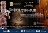 A través de FB: @CulturaCampusIrapuatoSalamanca se proyectará el documental "Patrimonio vivo para todos. 500 años de historia musical de México", una gestión entre distintas instituciones culturales para la difusión coordinada de este documental realizado durante 8 meses por la Orquesta Típica de la Ciudad de México. La transmisión se realizará el 15 de octubre a las 17 horas.