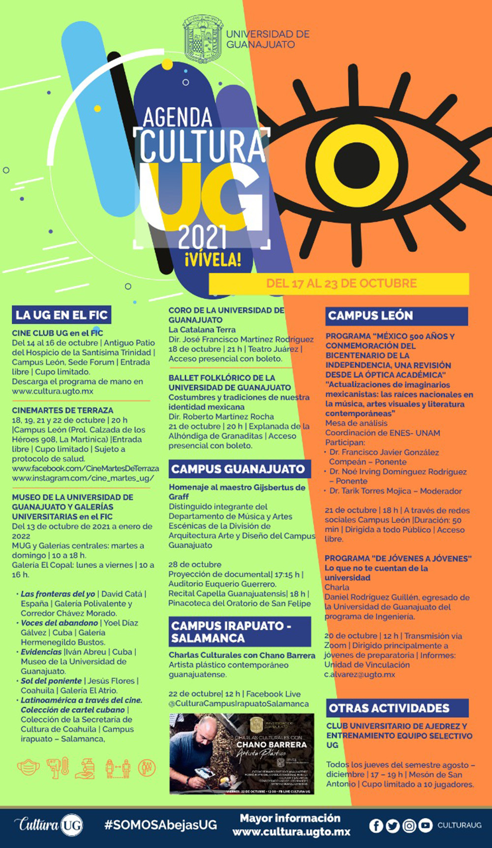 Guanajuato, Gto., a 15 de octubre de 2021.- La Universidad de Guanajuato (UG) estará presente en el festival cultural más importante de México y de América Latina, el Festival Internacional Cervantino (FIC), que como cada año tendrá entre sus escenarios distintos recintos universitarios, así como el talento de la comunidad artística que forma parte de la programación de la edición 49 del festival.