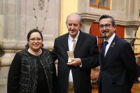 En la ceremonia de reconocimiento, la Dra. Teresita de Jesús Rendón Huerta Barrera, Rectora del Campus Guanajuato y el Mtro. José Osvaldo Chávez Rodríguez, Director de Extensión Cultural de la UG, en representación del Rector General, Dr. Luis Felipe Guerrero Agripino, le hicieron entrega de una medalla al homenajeado.