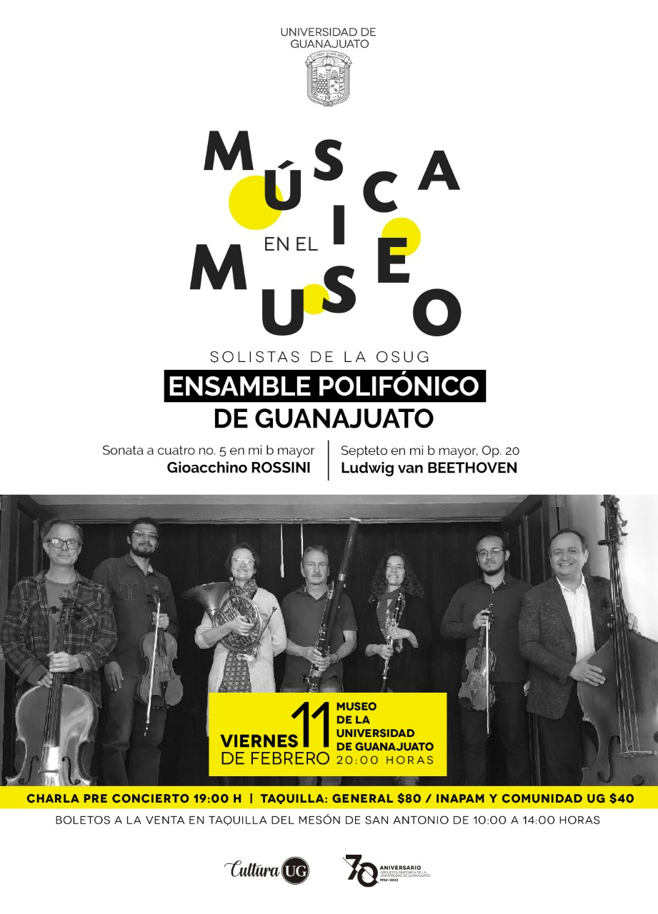El próximo 11 de febrero el Museo de la Universidad de Guanajuato, MUG, recibirá en el escenario al Ensamble Polifónico Guanajuato, conformado por destacados músicos de la Orquesta Sinfónica de la Universidad de Guanajuato (OSUG). La cita es a las 20:00 h. Los boletos están a la venta en el Mesón de San Antonio de 10 a 14 horas. Taquilla: General $80 pesos; y comunidad universitaria e INAPAM $40 pesos.