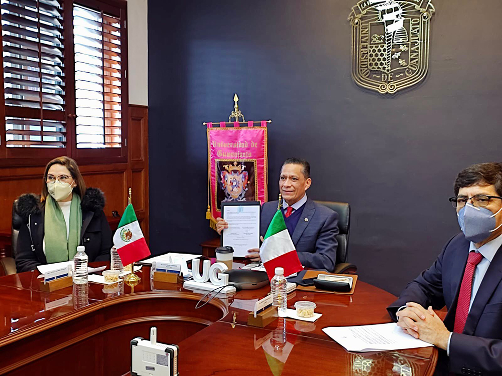 Guanajuato, Gto., a 8 de febrero de 2022.- Se llevó a cabo la firma de un memorándum de entendimiento entre la Universidad de Estudios de Cagliari, Italia y la Universidad De Guanajuato (UG). Este documento tiene por objeto la creación de la cátedra Jorge Ibargüengoitia de Literatura entre ambas instituciones.