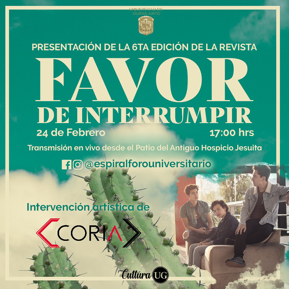 Con gran entusiasmo iniciará Espiral Foro Universitario con la presentación de la 6ta edición de la revista ¡Favor de Interrumpir! este 24 de febrero a las 17:00 horas, en formato hibrido, a través de Facebook Live @EspiralForoUniversitario y desde el Patio del Antiguo Hospicio Jesuita, evento que estará acompañado por la presentación del grupo estudiantil de música CORIA.