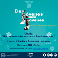 Finalmente se invita a la charla "Nuevas tecnologías para valorar función pulmonar", a cargo de la M.C.A Saraí Domínguez Hernández dentro del programa "Divulgación de la Ciencia" este 23 de marzo a las 12:00 horas a través de Zoom: https://bit.ly/3hBJuoj.