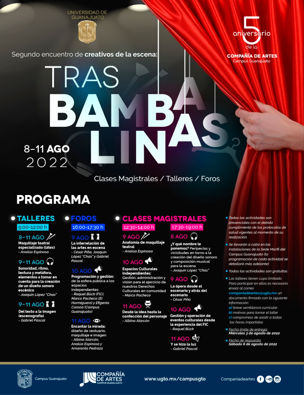 El Campus Guanajuato presenta del 8 al 11 de agosto el "Segundo encuentro de creativos de la escena: Tras Bambalinas" dentro del 5° Aniversario de la Compañía de Artes del campus, con la realización de clases magistrales, talleres y foros. Consulta el programa en: www.ugto.mx/campusgto.