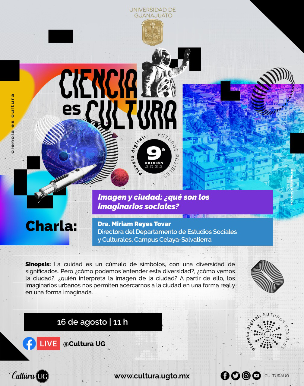 En Ciencia es Cultura, corresponde la divulgación de la charla "Imagen y ciudad: ¿qué son los imaginarios sociales?" con la Dra. Miriam Reyes Tovar, Directora del Departamento de Estudios Sociales y Culturales del Campus Celaya-Salvatierra, una charla que permite acercarse a los símbolos de las ciudades y sus diversos significados, este 16 de agosto a las 11:00 horas vía FB Live @CulturaUG.