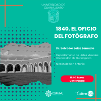 La última conferencia del día será impartida por el Doctor en Historias del Arte, Salvador Salas Zamudio, maestro actual de la Universidad de Guanajuato, quién compartirá "1840. El oficio del fotógrafo" al describir como fue el desempeño de la labor del fotógrafo/a en México y su impacto a nivel social, histórico, económico, y político en aquel entonces.