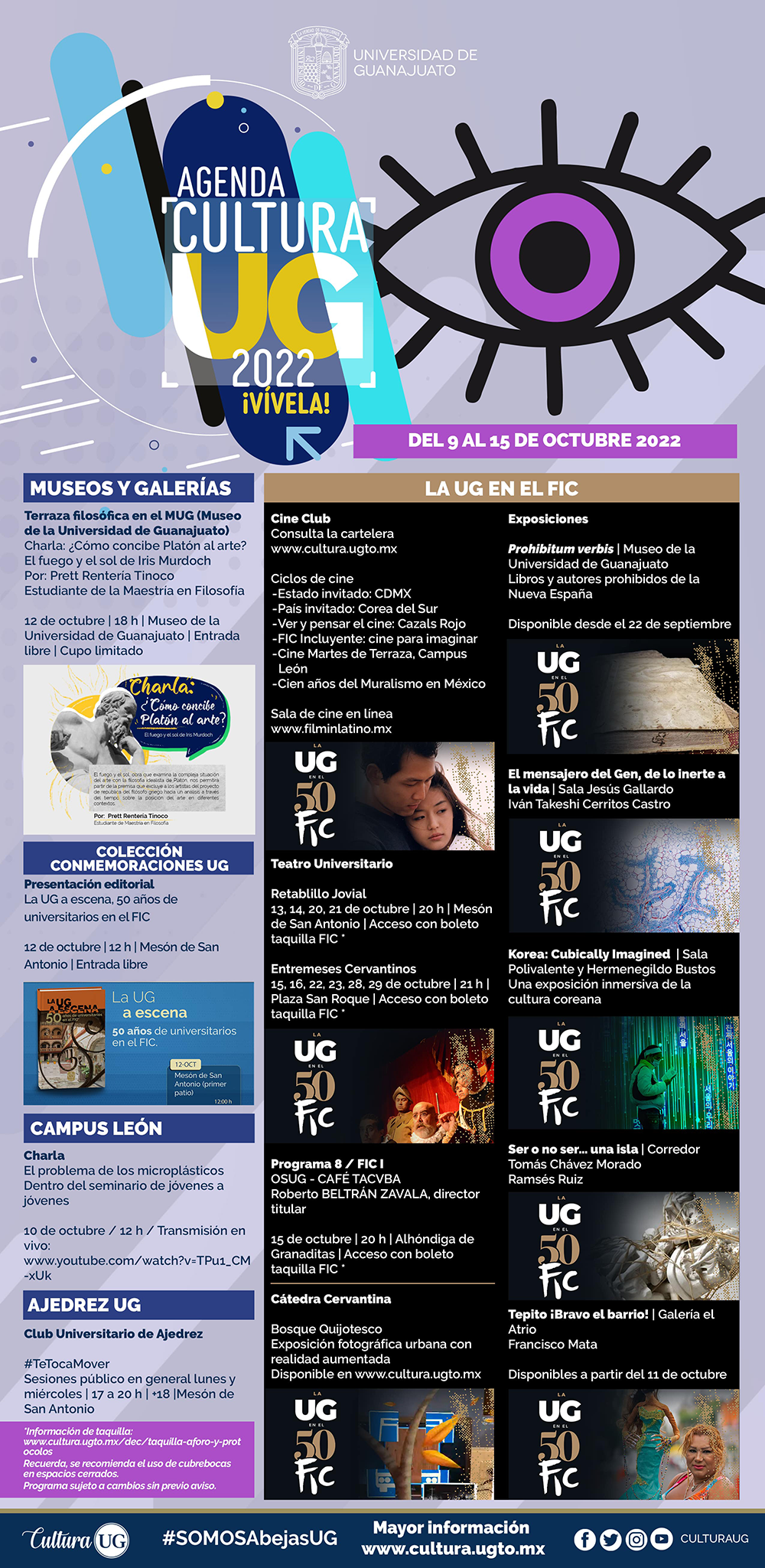 Guanajuato, Gto., a 07 de octubre de 2022.- La Universidad de Guanajuato (UG) invita a la ciudadanía a sumarse a las diferentes actividades académicas, artísticas y culturales a celebrarse durante la siguiente semana, del 9 al 15 de octubre, en donde habrá exposiciones, conciertos y presentaciones de temáticas diversas y para todos los gustos.