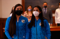 En representación de las y los medallistas, así como de las y los deportistas que se encuentran próximos a competir, autoridades universitarias hicieron la entrega simbólica de los uniformes a las alumnas y alumnos: Ángel Rocha, Mauricio Azanza, Berenice Sánchez Arroyo y Cynthia Itzel Arredondo, mientras que el banderín lo recibieron Luisa Contreras y Edson Lona.