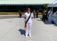 Irapuato, Gto., a 30 de mayo de 2022.- La profesora de la Universidad de Guanajuato (UG), Daniela Moreno Mondragón, es una de las trabajadoras de la salud que recibió el reconocimiento "Miguel Hidalgo" grado banda, por su labor en el área de terapia intensiva en el 8.º regimiento blindado de reconocimiento de la XII Región Militar, donde estuvo al cuidado de los pacientes más críticos de COVID-19.