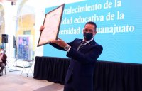 Al finalizar su participación, entregó al Rector General -como representante de la Universidad de Guanajuato-, el primer Reconocimiento Fénix como modelo a la excelencia y de la responsabilidad social de México.