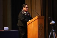 En representación del Director del Departamento de Ingeniería en Minas, Metalurgia y Geología, Dr. Martín Caudillo González, la Mtra. Elia Mónica Morales Zárate, profesora y responsable del Museo de Mineralogía, dio un mensaje de bienvenida y ofreció un contexto histórico del programa educativo de Ingeniería en Minas, al tiempo que expresó el orgullo compartido por ser parte de este gremio.