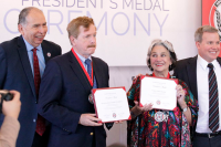 Guanajuato, Gto., a 8 de agosto de 2022.-En la Nueva Zona UG de la Universidad de Guanajuato (UG), se llevó a cabo entrega de la Medalla Presidente al Mtro. Juan Carlos Romero Hicks, egresado y ex Rector de la Casa de Estudios, así como a su esposa, Frances Siekman. Esta distinción, otorgada por la Universidad del Sur de Oregón (Southern Oregon University SOU), representa el más alto honor para dicha institución.