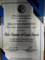 Su trayectoria académica, la investigación científica realizada, libros publicados, capítulos de libro, ponencias y demás en cualquiera de las áreas de la Psicología y/o posturas teóricas, le hicieron acreedora a este reconocimiento que le fue entregado en la IX Reunión Nacional de Investigación en Psicología, que se llevó a cabo en el Campus Ensenada de la Universidad Autónoma de Baja California.