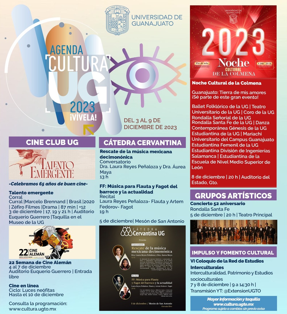 La Orquesta Sinfónica de la UG (OSUG) da la bienvenida a los festejos decembrinos con el “Concierto Navideño” que incluirá composiciones de Franz Joseph Haydn y de Nikolái Rimski-Kórsakov, el 3 de diciembre a las 12:00 horas en el Teatro Juárez, mientras que la Rondalla Santa Fe UG celebrará su 52° aniversario con un concierto sobre el escenario del Teatro Principal, el próximo 5 de diciembre a las 20:00 horas.