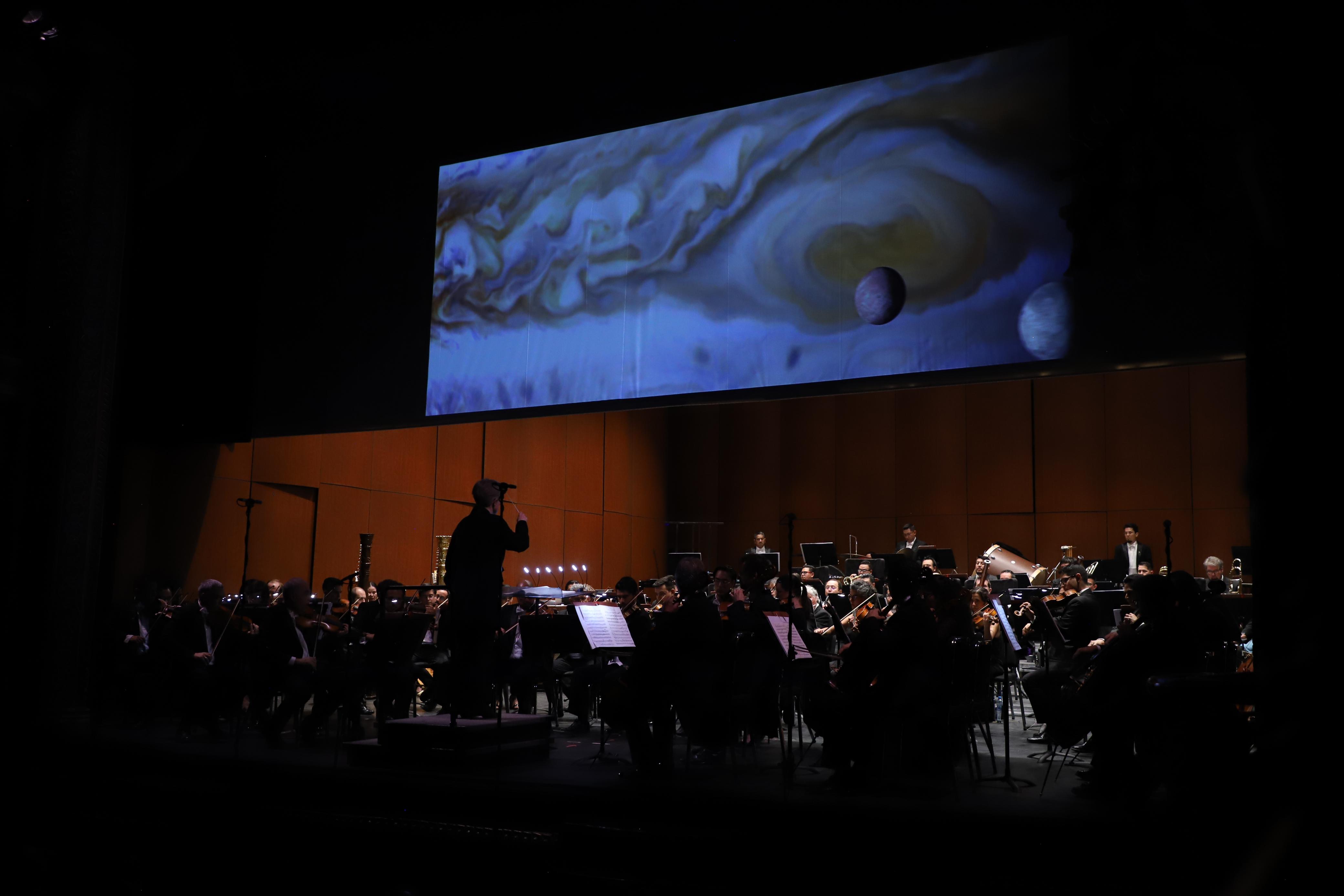 Engendrada durante “La Gran Guerra”, la suite orquestal del compositor británico nacido el 21 de septiembre de 1874 presenta en siete movimientos (excepto Plutón) a los cuerpos celestes que orbitan alrededor del Sol. La Orquesta Universitaria, acompañada de una proyección de video sobre el proscenio, interpretó las notas de: Marte, El mensajero de la guerra; Venus, El mensajero de la paz; Mercurio, El mensajero alado; Júpiter, El mensajero de la alegría; Saturno, El mensajero de la vejez; Urano, El hechicero y Neptuno, El místico.