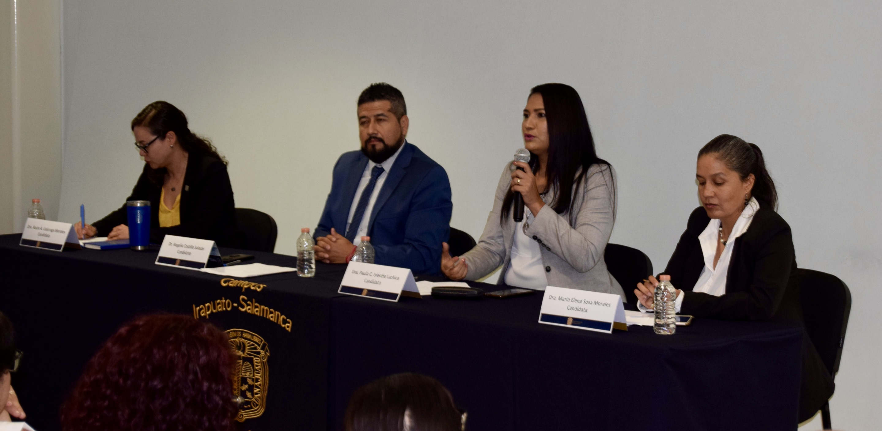 Las candidatas y el candidato que participan en el proceso se presentaron ante la comunidad de la sede Salamanca para exponer sus respectivas propuestas. Cada participante dispuso de 20 minutos para exponer y al término de las cuatro participaciones, hubo una sesión de preguntas por parte de la comunidad universitaria.